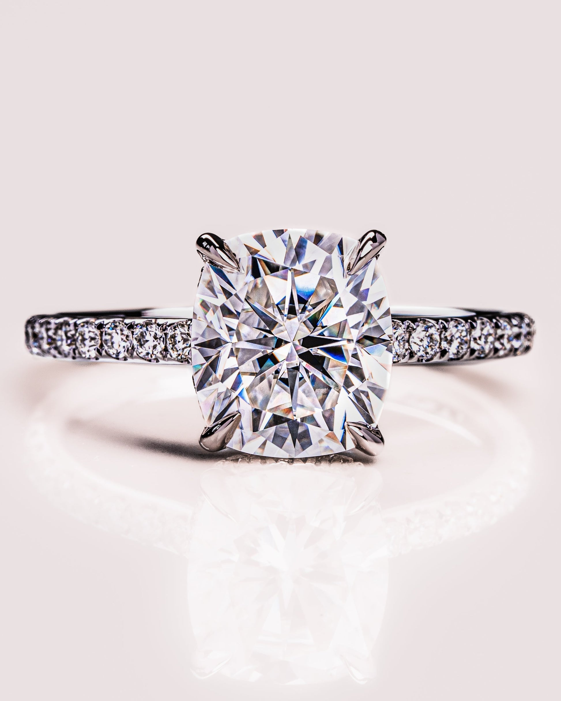 0.96 CT Cushion Moissanite Engagement Ring With Hidden Halo & Pave Setting
