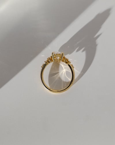 - Side Stones: 0.26 TCW Round Cut Moissanite (DEF/VVS)