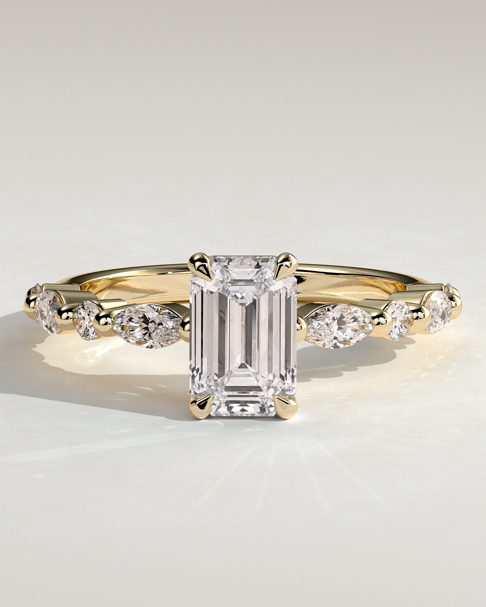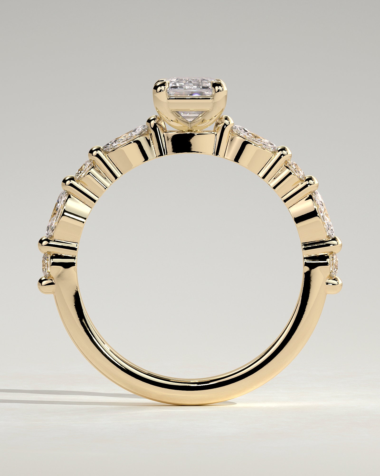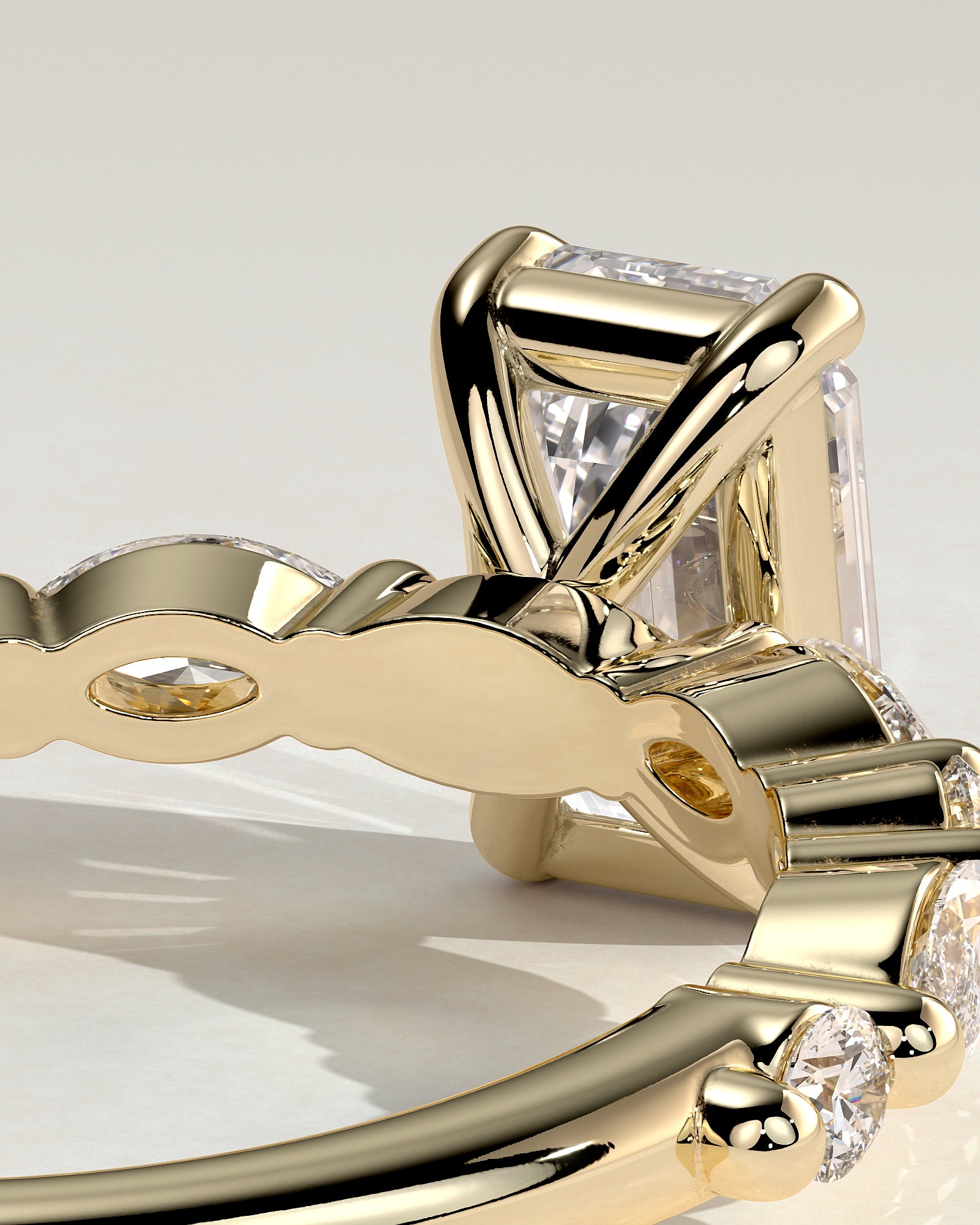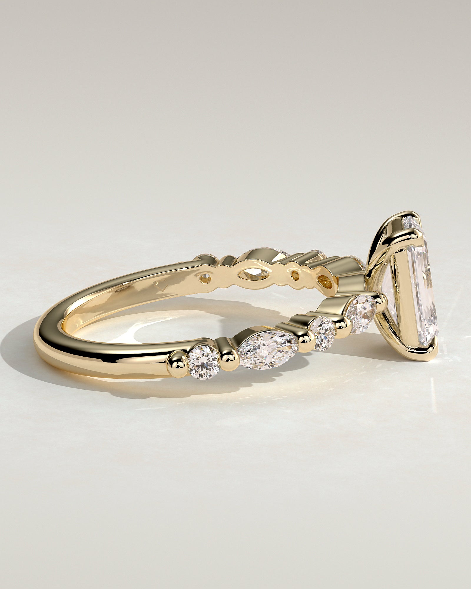 - Side Stones: 0.7 TCW Marquise & Round Cut Moissanite (DEF/VVS)