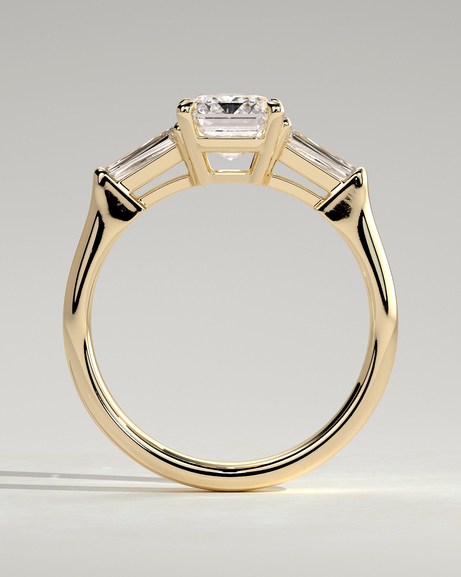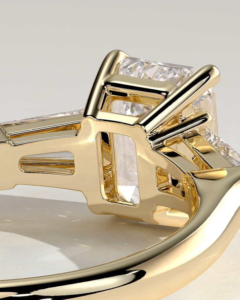 - Side Stones: 0.46 TCW Tapered Baguette Cut Moissanite (DEF/VVS)