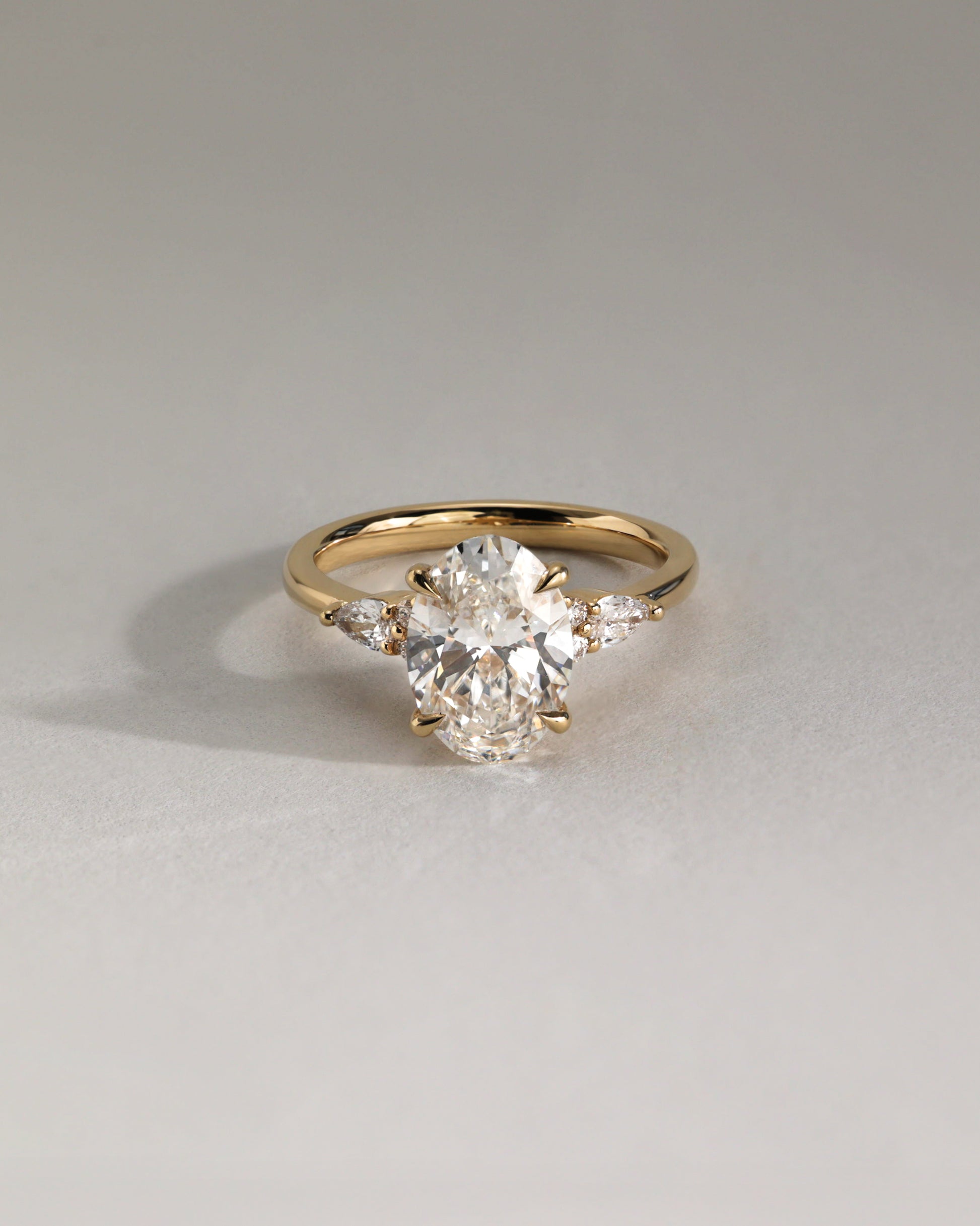 - Side Stones: 0.42 TCW Round & Pear Cut Moissanite (DEF/VVS)